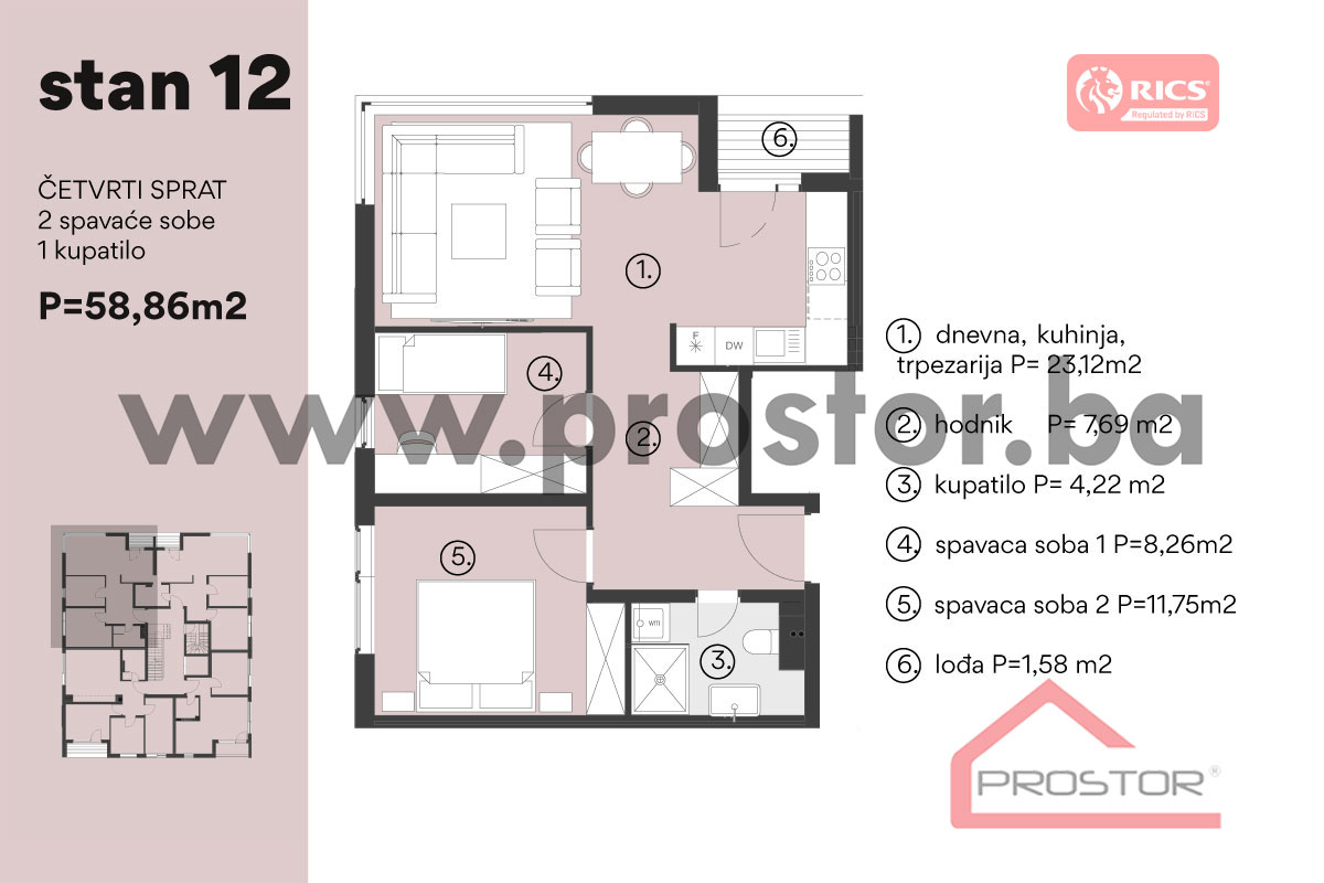 - Stanove projektovane površine od cca 41m2 do 65m2 na etaži četvrtog sprata kao i