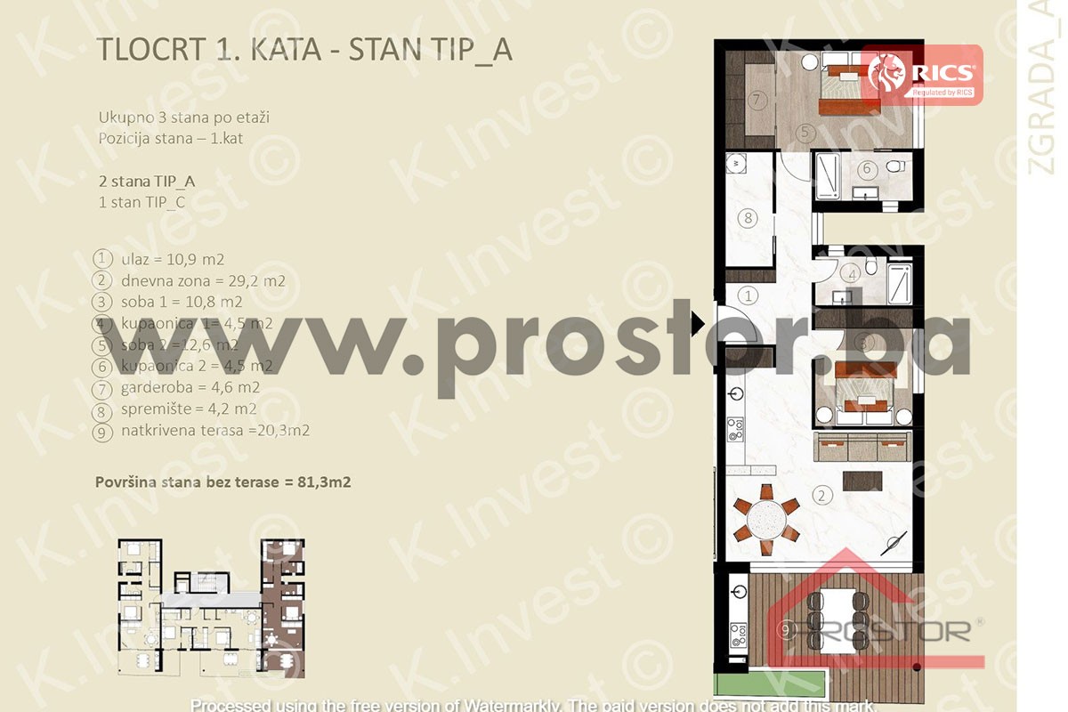 Stambena površina ovog apartmana bez terase iznosi 81,30 m2, dok je površina terase 20,30 m2. Uz apartman se kupuje i ostava i parking mjesto, tako da je ukupna netto površina svih etažnih djelova 101,60 m2.