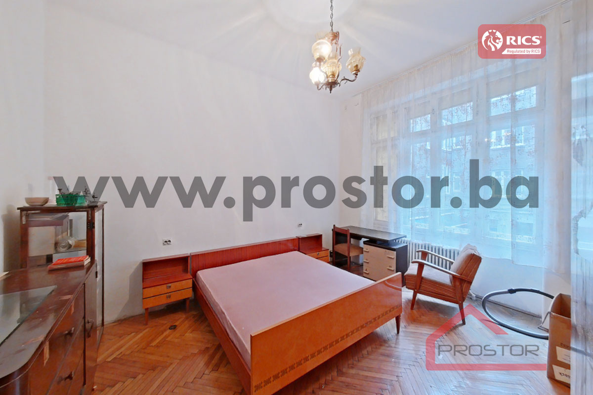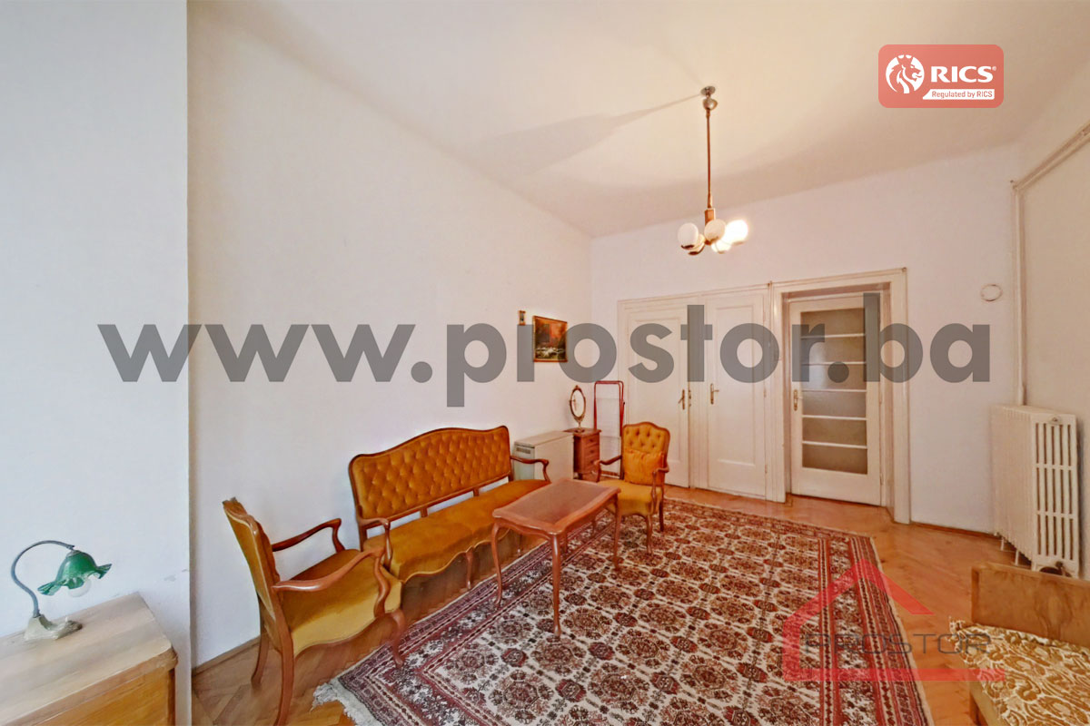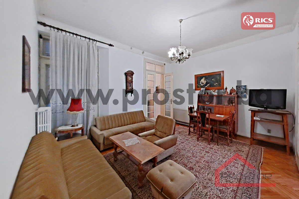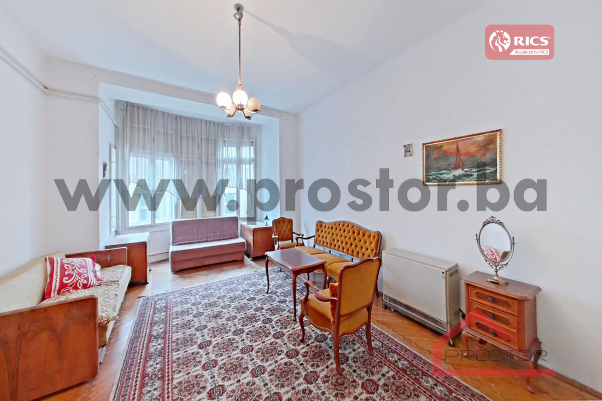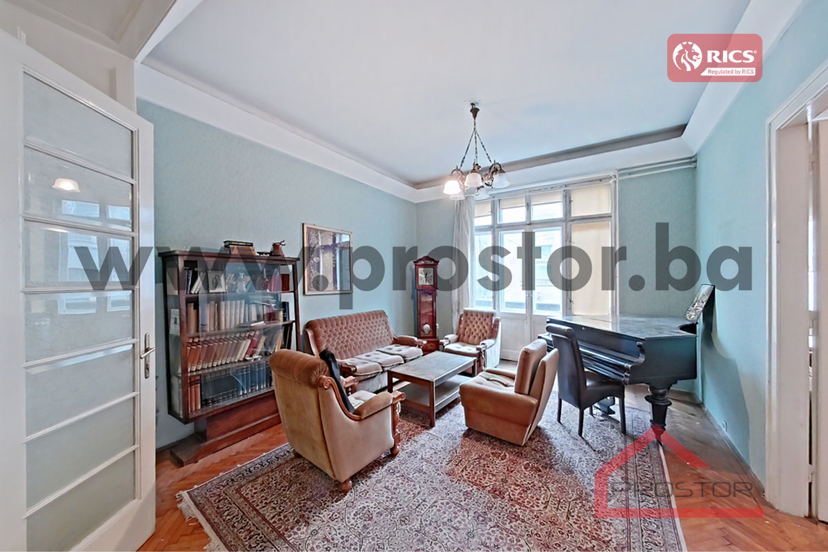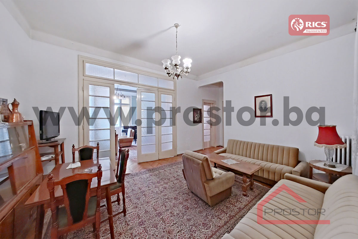 Prodaje se prostran salonski stan sa lođom i balkonom uknjižene površine 135m2 smješten na prvom spratu stambene zgrade sa liftom u ulici Maršala Tita, preko puta Centralne Banke. Zgrada u kojoj je smještena predmetna nekretnina izgrađena je za vrijeme austro-ugarskog perioda.
