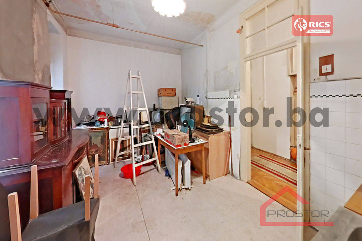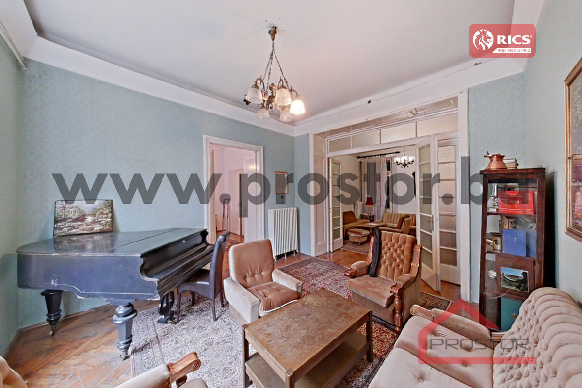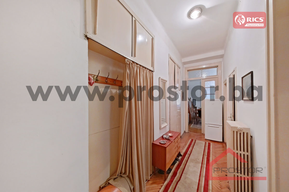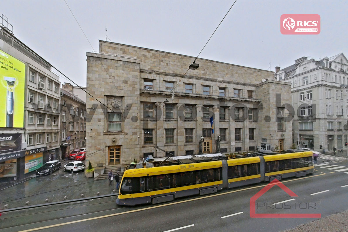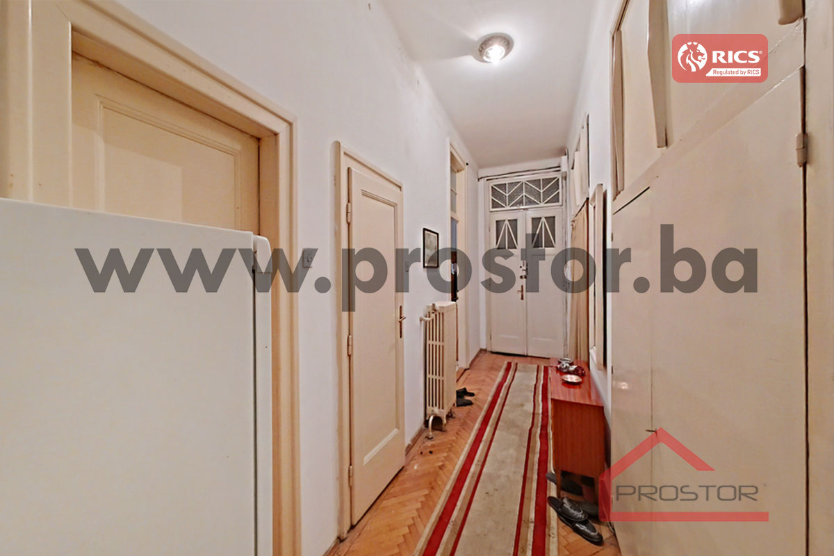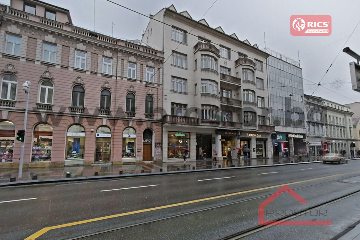 Prodaje se prostran salonski stan sa lođom i balkonom uknjižene površine 135m2 smješten na prvom spratu stambene zgrade sa liftom u ulici Maršala Tita, preko puta Centralne Banke. Zgrada u kojoj je smještena predmetna nekretnina izgrađena je za vrijeme austro-ugarskog perioda.