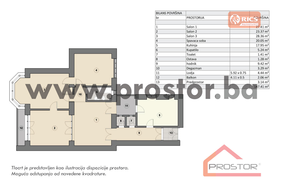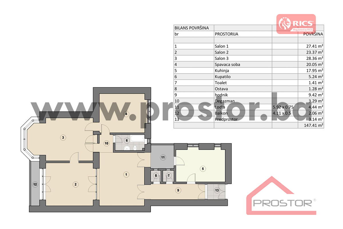 SADRŽAJ Stan se sastoji od dnevnog boravka, dvije spavaće sobe, salona, kuhinje u kombinaciji sa trpezarijom, kupatila, toaleta, lođe, balkona, ostave, predulaza i predsoblja.