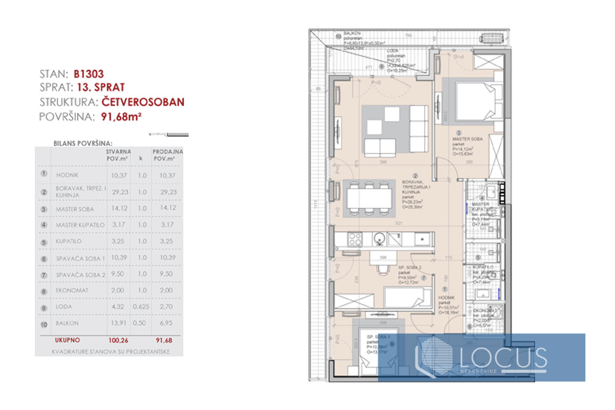 Četverosobni stanovi sastoje se od dnevnog boravka u kombinaciji sa kuhinjom i trpezarijom, master spavaće sobe površine cca. 14m2, dvije spavaće sobe, dva kupatila, ekonomata, lođe, balkona i hodnika.