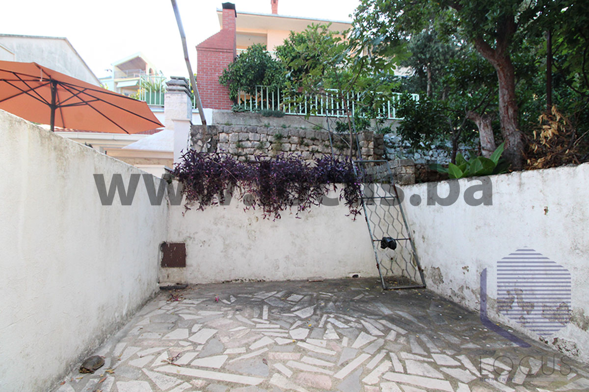 Ispred ulaza je vanjsko parking mjesto koje je popločano kvalitetnim kamenom. U prizemlju je smještena prostrana garaža sa manjom kuhinjom i toaletom.