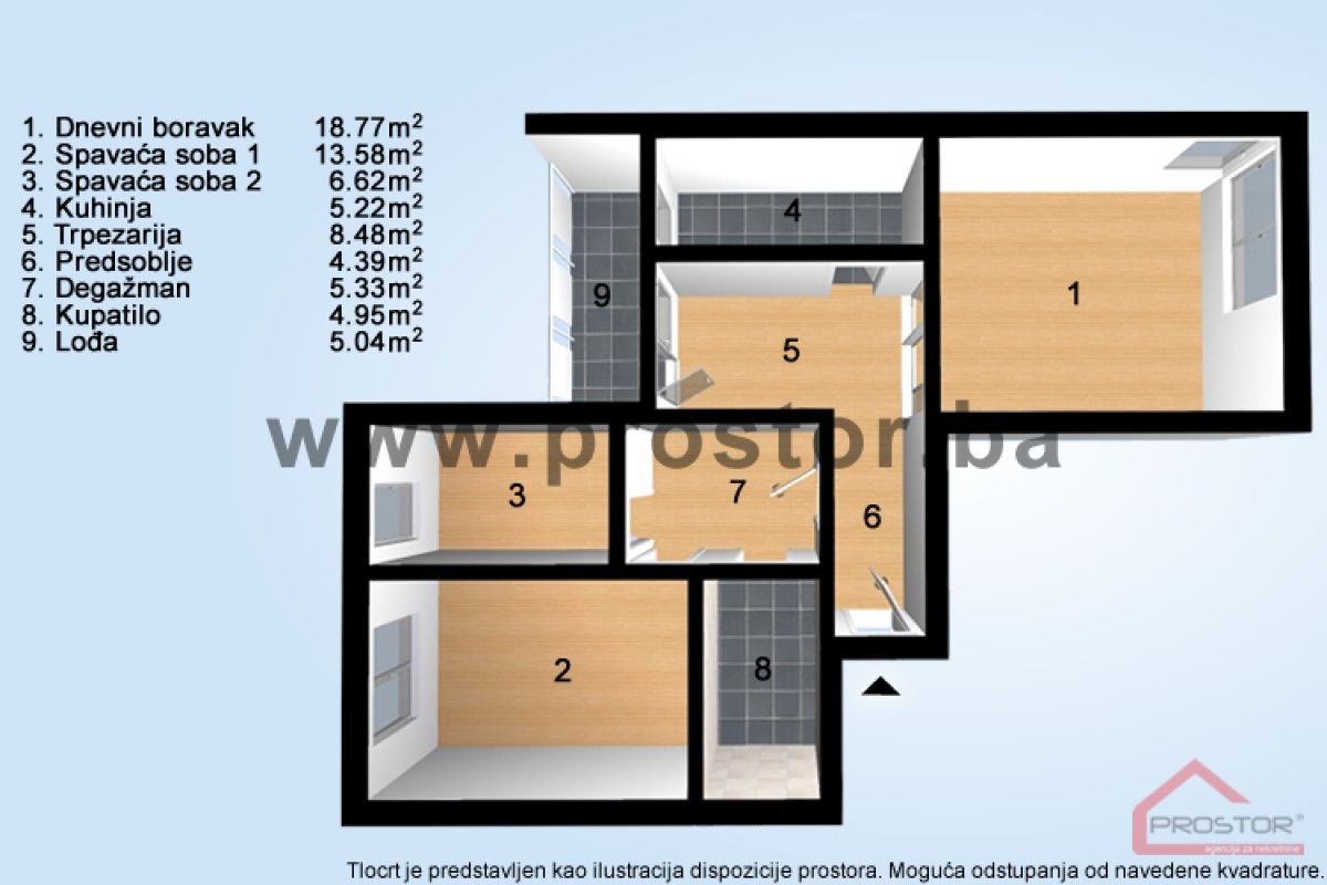 Istaknute karakteristike stana su: dvostrana orijentacija (Istok-Zapad), odličan raspored prostorija sa dvije cjeline (dnevno-boravišni i spavaći dio) odvojene degažmanom i prostran balkon sa pogledom prema zapadnoj strani. Dodatna pogodnost je koristan prostor na balkonu i degažmanu koji je pogodan za postavljanje plakara.
