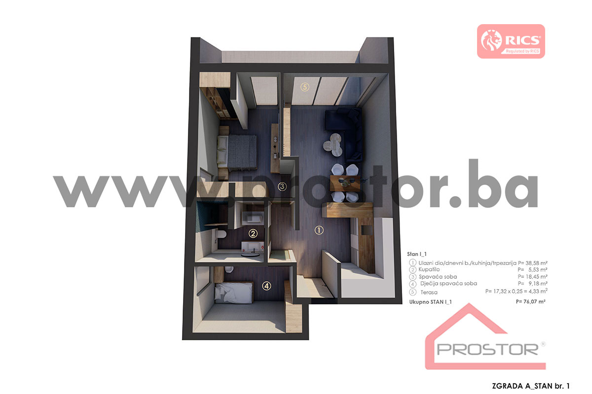 Sa zadovoljstvom Vam predstavljamo vrhunski tip trosobnog stana sa terasom, projektovane površine cca 76m2, savršene dvostrane jugozapadne orjentacije, dostupan na etaži I sprata. Predmetni tip stana raspolaže sa izuzetno prostranim dnevnim boravkom sa kuhinjom projektovanim u savremenoj "open space" kombinaciji, površine cca 38m2, spavaćom sobom površine cca 18m2, dječijom spavaćom sobom od cca 9m2, kupatilom i terasom. Pored mirne lokacije, uređenih površina za rezidente i djecu, kao pogodnost bi izdvojili i kvalitet gradnje kompletnog kompleksa RIVERSIDE uz princip grijanja putem sistema toplotnih pumpi koji se u zadnje vrijeme izdvaja kao vodeći u smislu ekonomski i ekološki najprihvatljivijih sistema grijanja koji se koriste u regiji i svijetu.